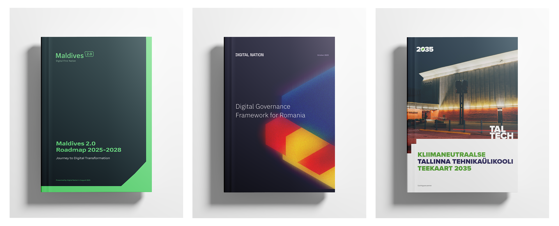 Print projects remained an important part of our work. Among the highlights were the roadmap for a climate-neutral Tallinn University of Technology by 2035, the Maldives 2.0 Roadmap 2025–2028 for digital transformation commissioned by the Government of the Maldives, and the Digital Governance Framework for the Romanian Government. We also produced an Arabic-language catalogue for Bon Vegan, adding another layer of linguistic and typographic complexity to the year.